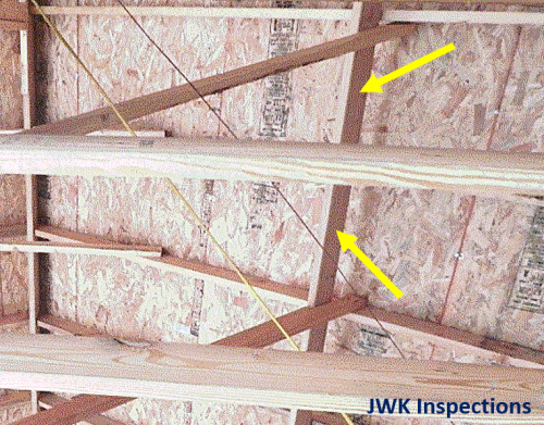 Photos above show missing (required) collar ties at the construction of 2 different roof frames at JWK Inspections Framing / Pre Drywall inspections in the San Antonio area.